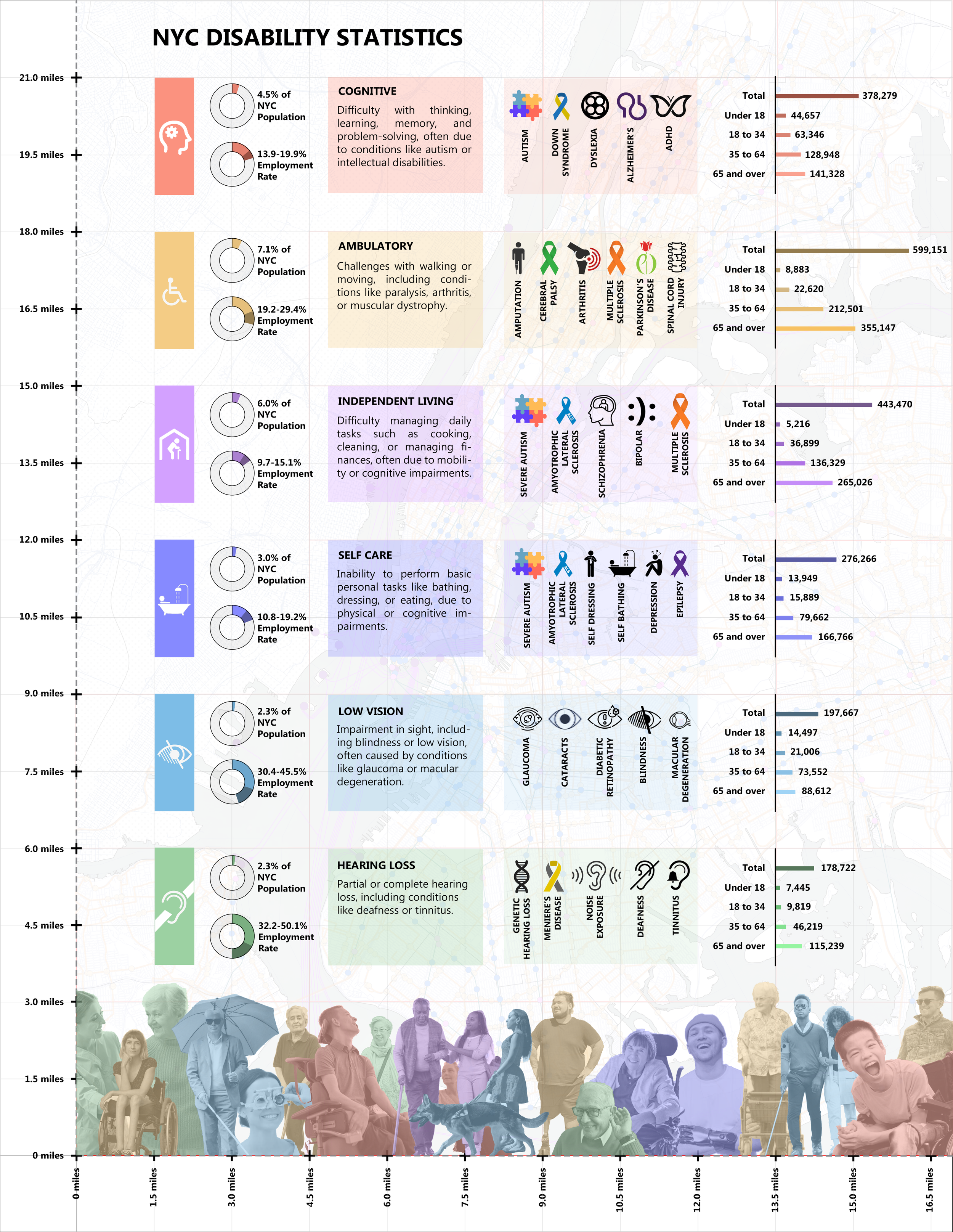Out of these categories, this thesis focuses specifically on the ambulatory, low vision, and hearing loss populations. Together, these three groups total approximately 975,540 individuals, which constitutes roughly 11% of New York City’s total population of 8,736,402.