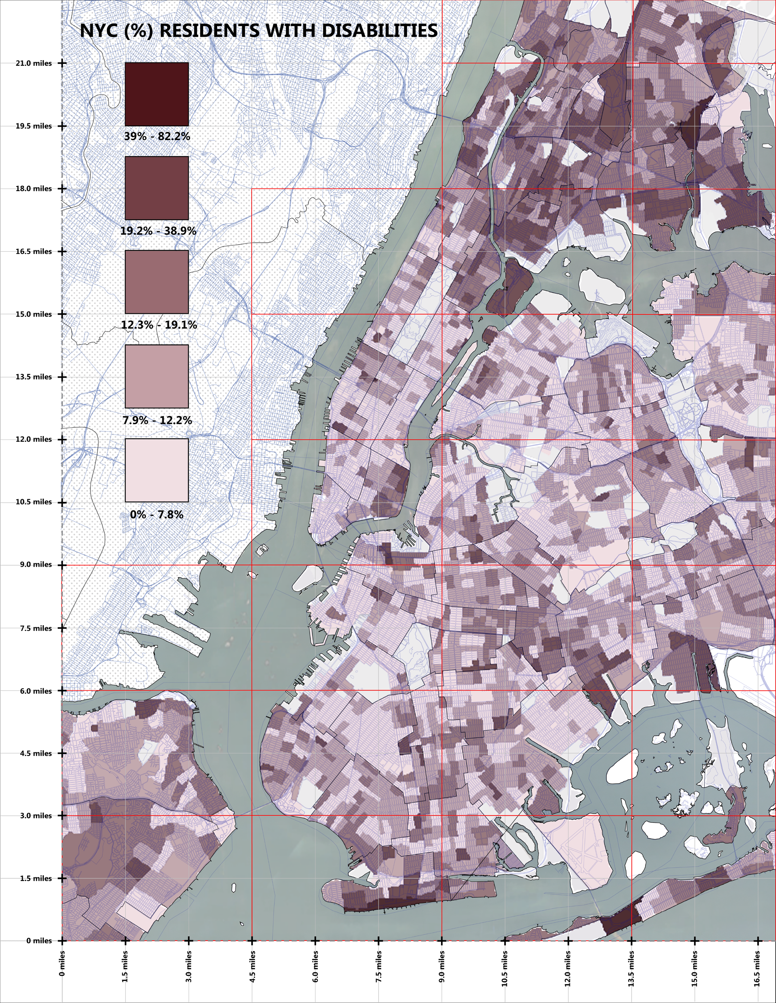 It is essential to view the maps that follow not as isolated studies, but as interrelated pieces of a larger puzzle. Each one offers a different lens through which to interpret the spatial realities faced by disabled New Yorkers. Taken together, these layers help build a more complete and nuanced understanding of the systemic factors that influence where and how disabled individuals live, move, and interact within the city.