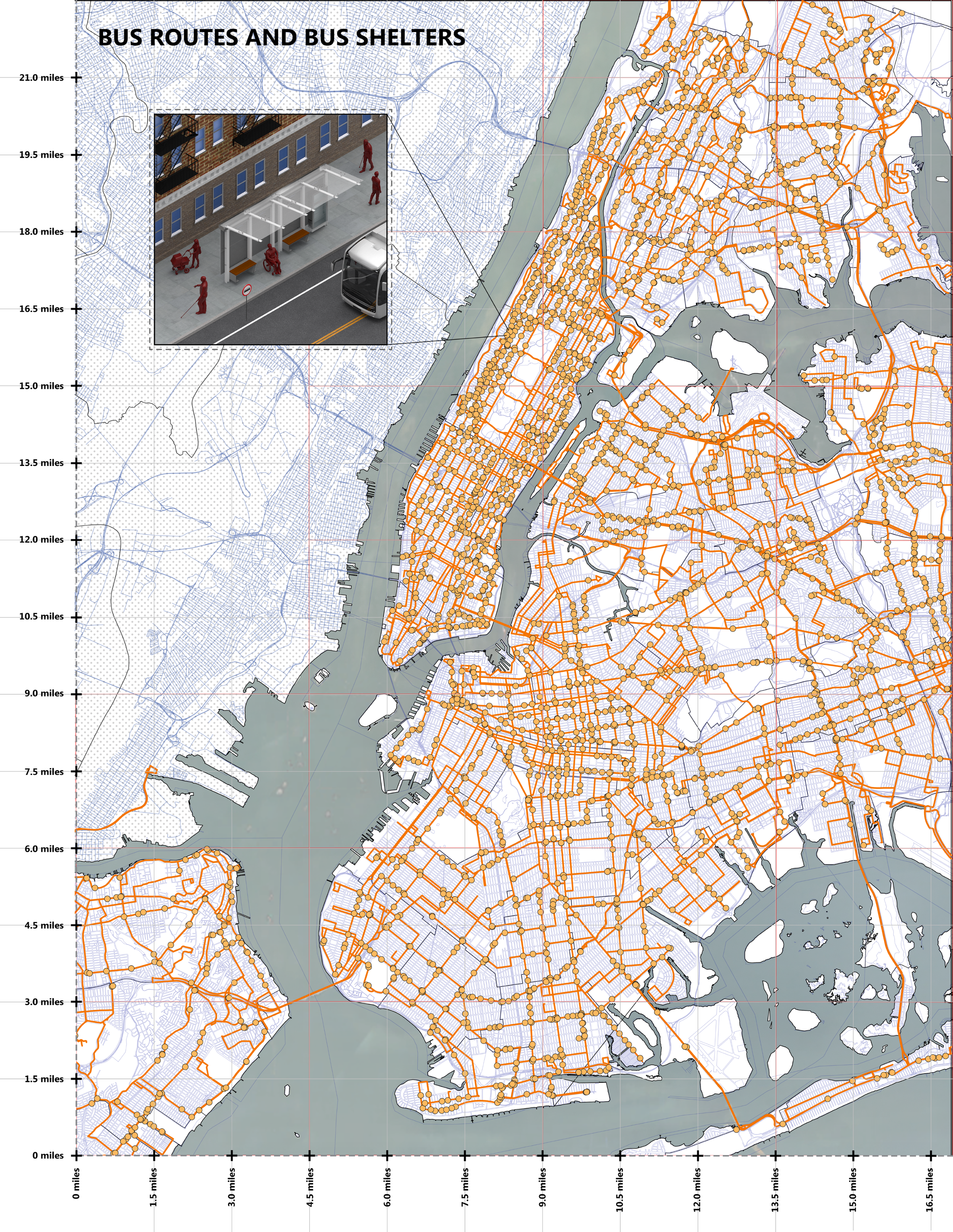 This mapping exercise examines New York City’s bus network, highlighting bus stops (yellow dots) and routes (orange lines) across the five boroughs. The map reveals a comprehensive and well-distributed system with strong geographic coverage that, on the surface, suggests promising access to public transit.