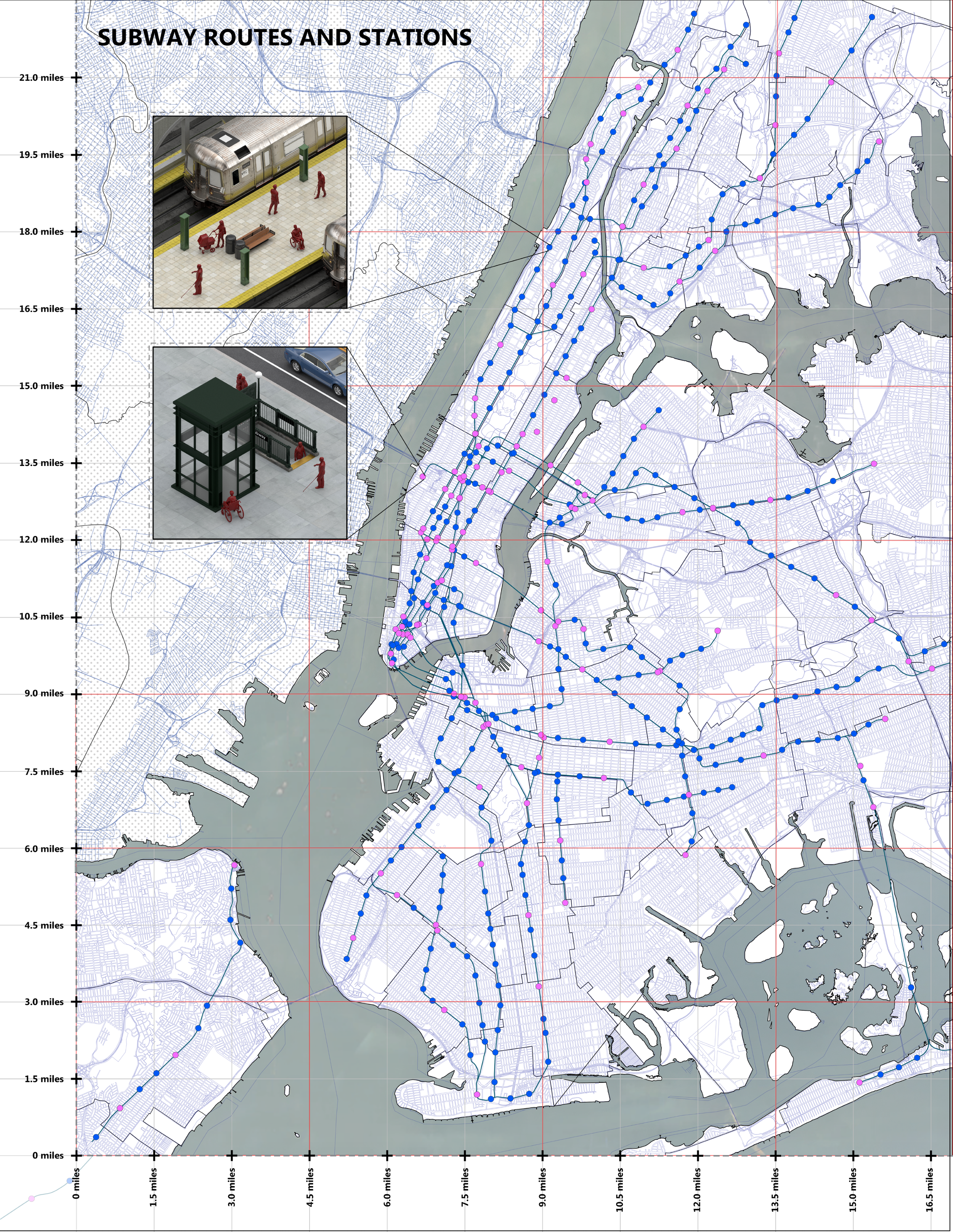 This mapping exercise focuses on subway station accessibility across New York City. On the map: