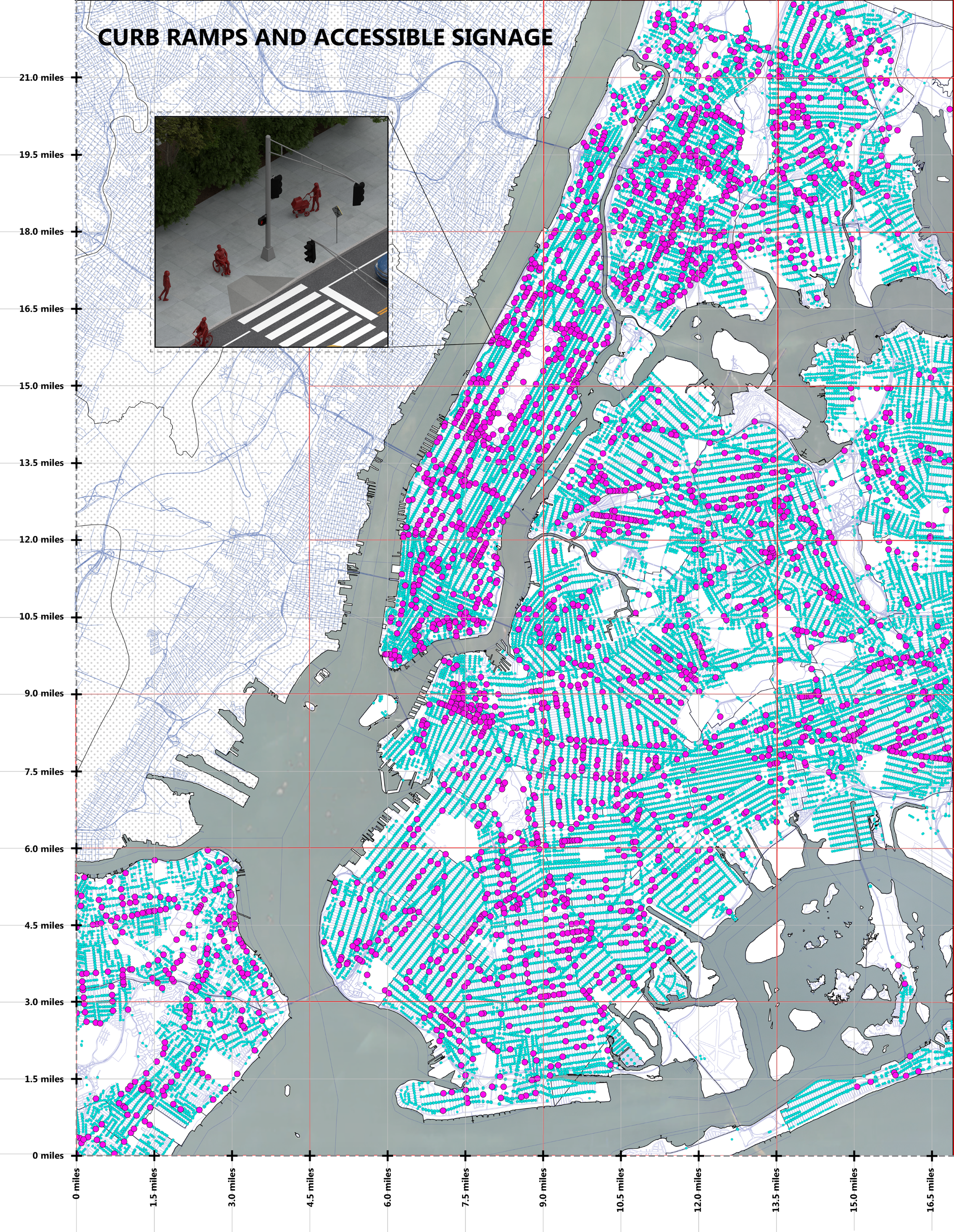This mapping exercise examines pedestrian mobility infrastructure across New York City, focusing on two key accessibility features: curb ramps and accessible pedestrian signals (APS).