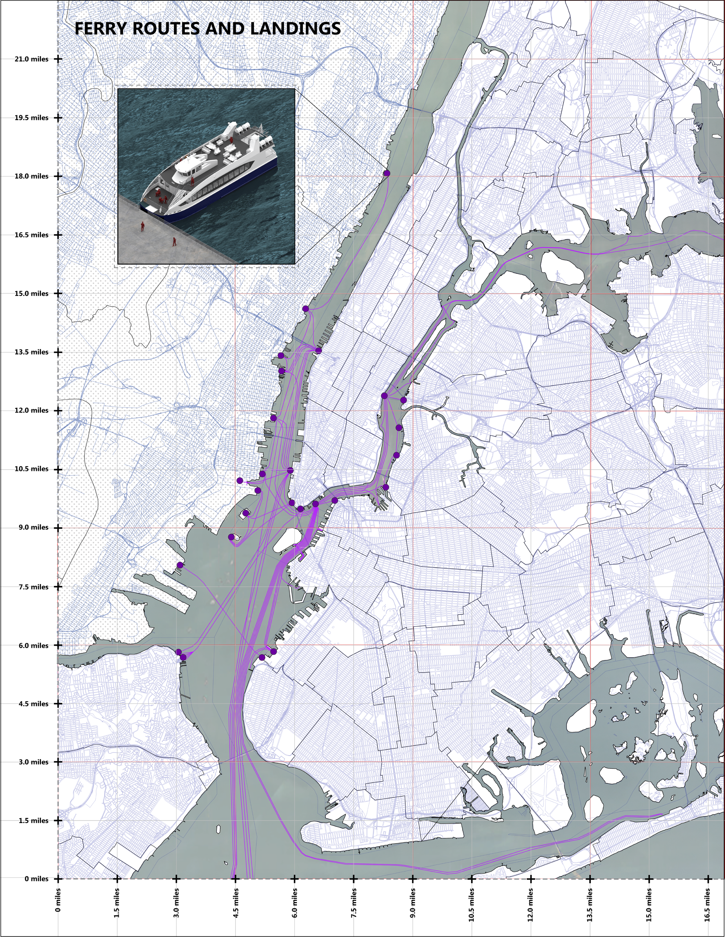 This exercise maps NYC Ferry infrastructure, with purple dots representing ferry stops and purple lines indicating ferry routes. While ferries are often overlooked as a mode of public transit, they offer a unique opportunity for waterfront and inter-borough travel.