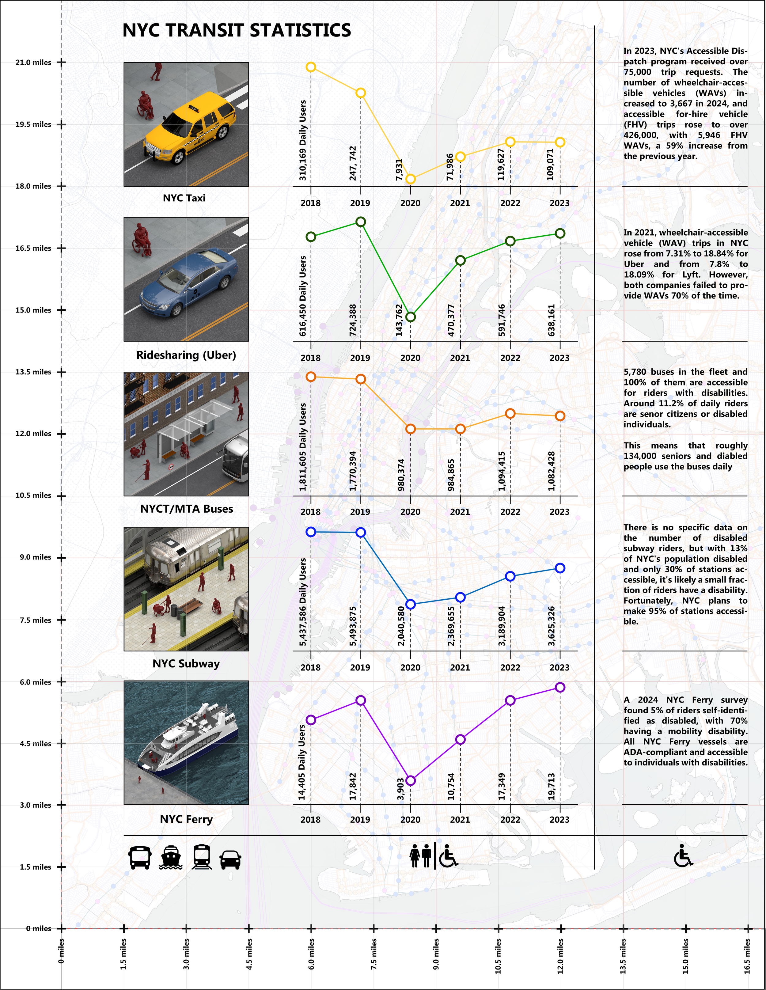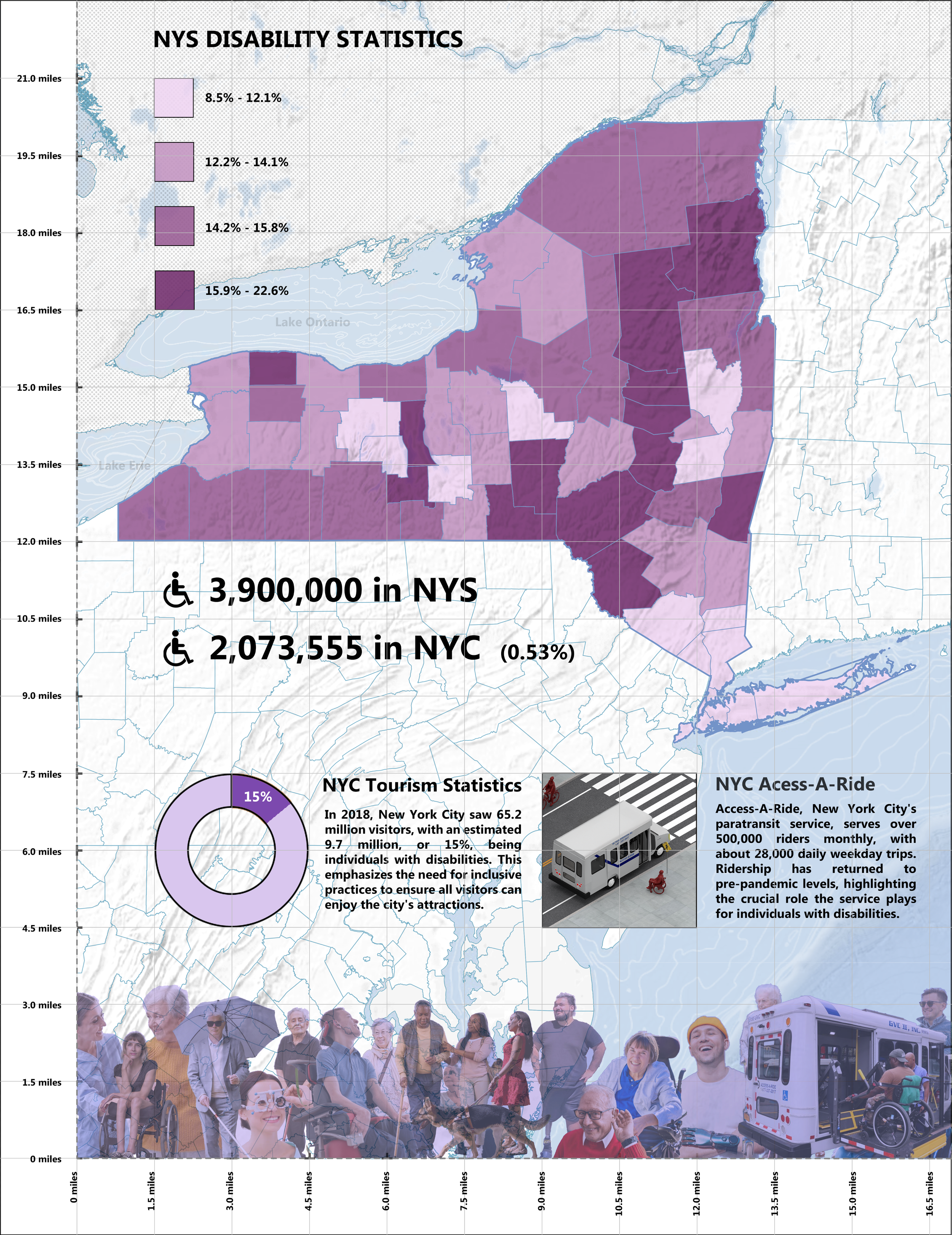 In addition to its residential population, New York City welcomes approximately 65.2 million tourists annually. It is estimated that 9.7 million of these visitors are disabled, further intensifying the demand for accessible urban systems that can serve both residents and tourists with diverse mobility, sensory, and communication needs.